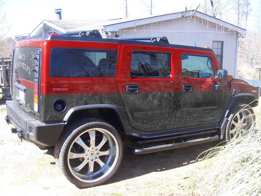 Ok so my cousins hummer got keyed and somebody busted the windshiled out so now hes going to repaint it. He wants a 2 tone paint job with some crazy graphics. Nothing ricey looking but more along the lines of a bad@$$ custom show car basically. He bought the rims and was gonna do the rest but something bad happened in his life setting him back. Now hes back on his feet and ready to finish this project. So far i know hes doing a differant grill (not in pic tho) chrome roof bars, chrome tail light covers, chrome handles, chrome mirrors and take the emblems off. Any of you experts feel like getting crazy and coming up with a possibilty of designing a paint job for this. Also he wants the 2 tone line just below the handles or mid way of the handles.