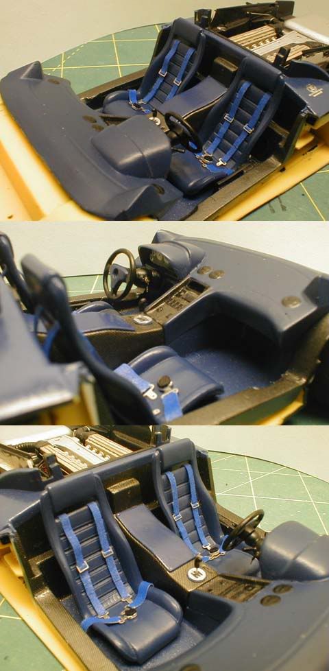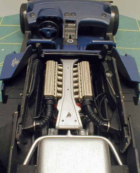 Exterior modifications include the front and rear bumpers, engine cover, rocker panels and wings. The doors were cut open and the door interior panels were scratchbuilt. The wheels were scratchbuilt and cast in resin, and the SE30 and bull badges were custom-photoetched. The body color was custom-mixed.