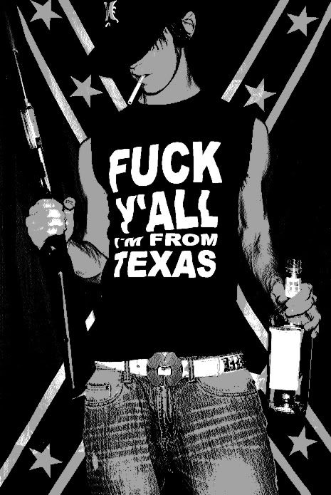 what's on my shirt in that picture is basically what it means to me "fuck yall" (anyone who doesn't like it) "im from texas" (im proud of my heritage and like to show it) the confederate "rebel" flag to me just screams four-wheelin in the mud, drinkin beers, and havin good dirty fun... the shit i grew up doing down here (the south) basically it's just an easy way to let people know who you are... not necesarilly a racist thing allthough it's very understandable to see how it can be perceived like that by people who aren't exactly "southern"