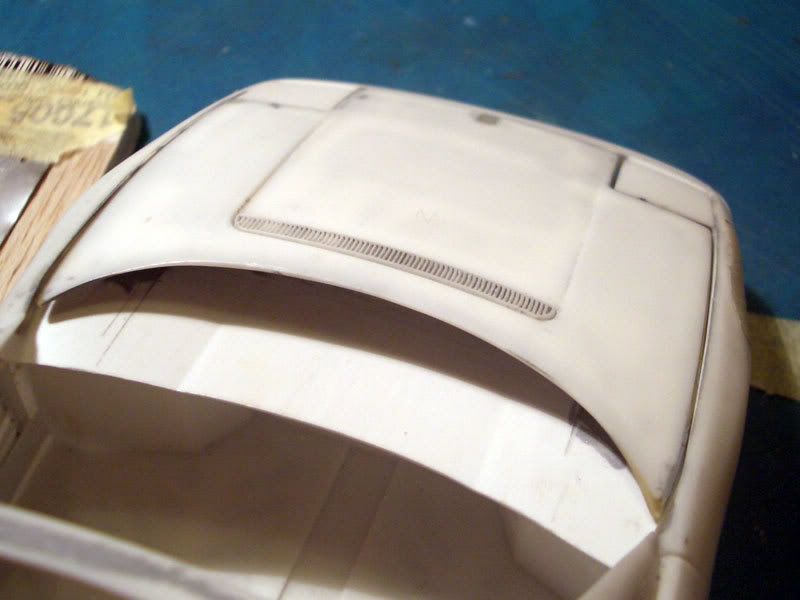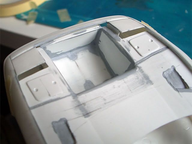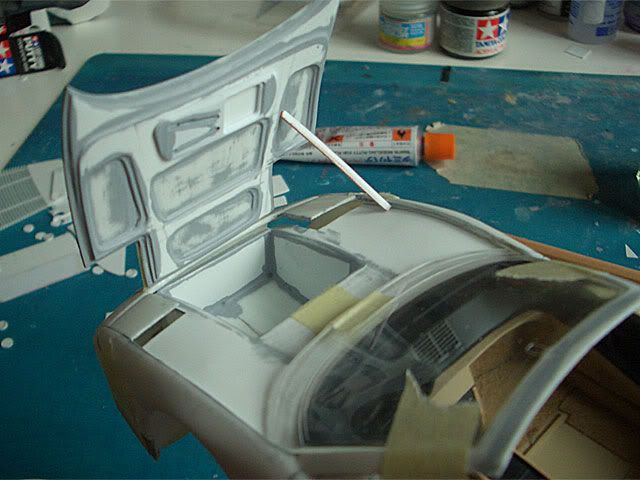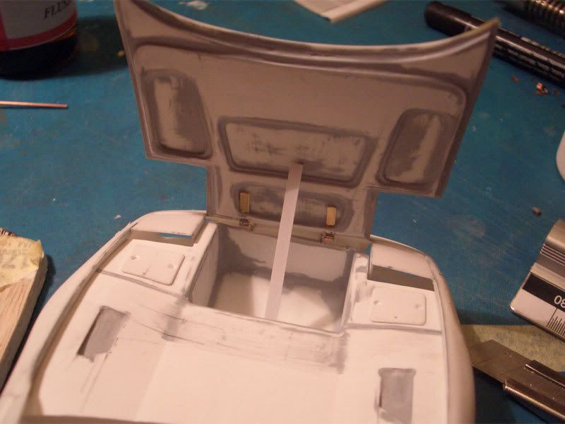Speacking of chassis I also done some job in front, creating the front booth, cutting out the hood and doing working hinges. I found Tamiya Light Curing Putty very reliable to extend and correct thin hood edges.