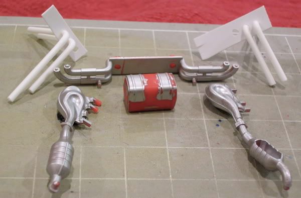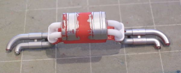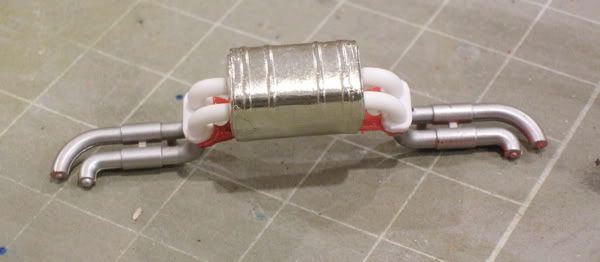 The stradale has a much shorter muffler so i had to modify it to be more accurate. i melted and bent some styrene rods to make the extra tubing needed for the modification. here is a pic of how it started out