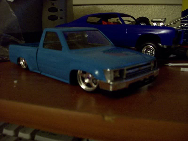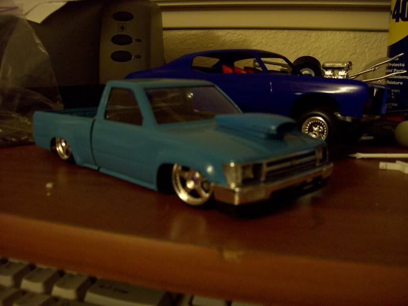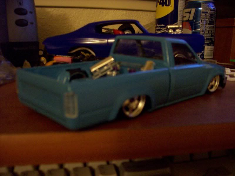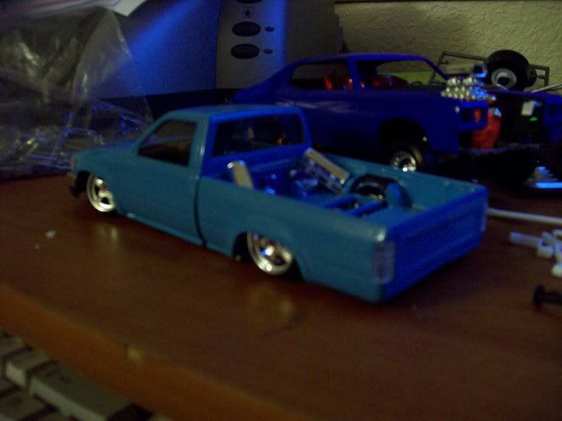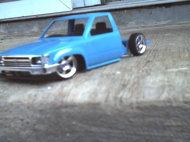 Ok well after qutie some time im back in the game. I recently had a qutie misfortunate acident (my house burned down) and i lost all of my models so now i have to start over and i got all my supplies together finally and i now have in progress this hilux. The paint color used on theframe is PG&E (Pacific Gas & Electric) Blue and the bed is just in the primer stages but eventually the enitre body will be PG&E blue. The coat of blue on the cab and front clip is only the 1st coat, i still have to wet sand it and put on about 2 more coats then a coat of clear. I only have a coupe of pics so you'll have to bear with me, and sorry for the poor quality on some of the pics.