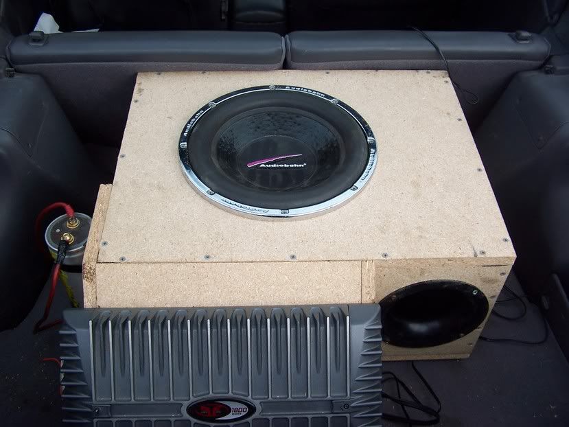 The box is carpeted now but not installed in the car. I have a jvc head unit, audiobahn component 6.5"s in front and audiobahn 6x8 components in the rear with a 250watt 4 channel amp and one audiobahn AW1200Q sub with a rockford 1800watt amp and a LA 1 farad cap and all monster cable, oh and I have an Ipod to:) I built the box myself and if you cant tell I like audiobahn