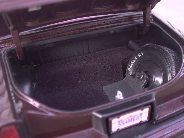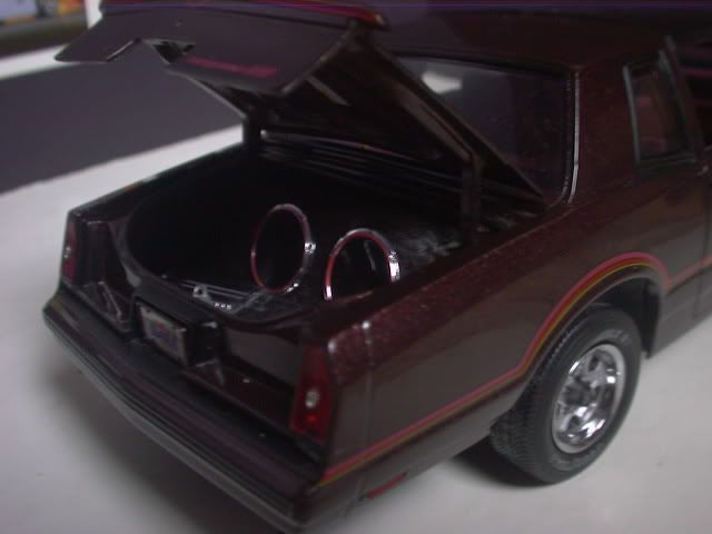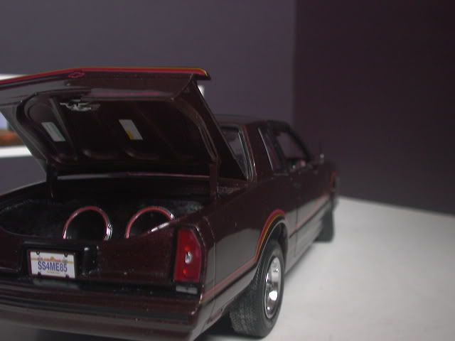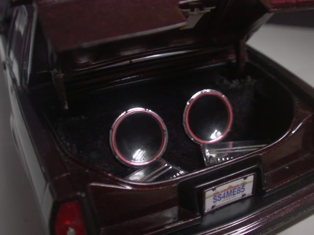Just a little update.. I am currently working on a Sub box for the trunk of the car.. the only thing I had to change around was removing the spare tire and the spare tire holder.. I made the inside of the trunk more squared off.. and all I need now is some black and maroon flocking, then it will be done. in scale I dont know if the 2 subs are 12inch or 15inch.. and then the amp.. and probably a monitor between the 2 subs.. I will post pictures as soon as I get the flocking.. for thoes who fallow this post.. THANKS!