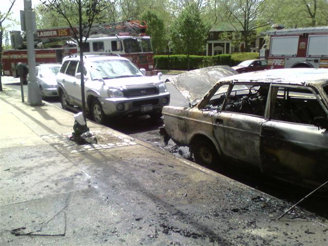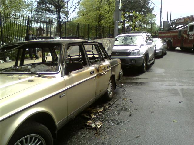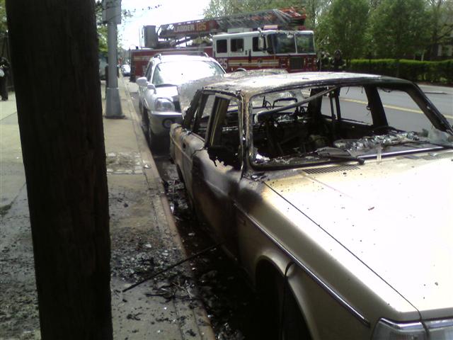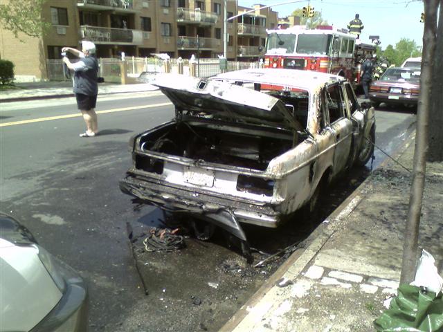 you finally get in go downstairs and you see that it is not your car but the car in front of you up in flames. But luckily the fire department has put the flames out. They wouldn't let me in the area and you tell the fireman, "but thats my car behind it, shouldn't I move it". and he says "why bother".