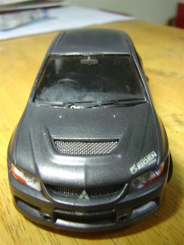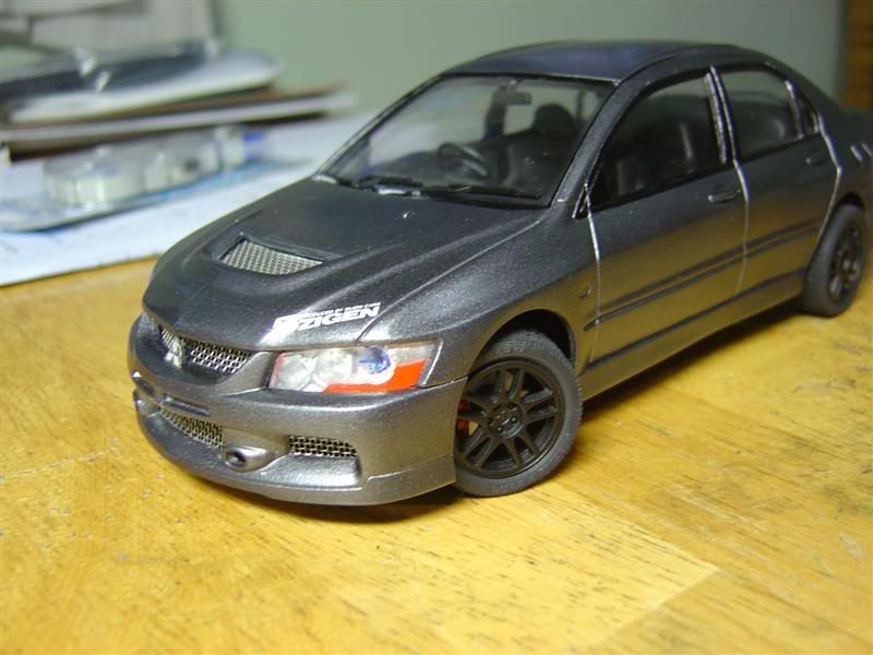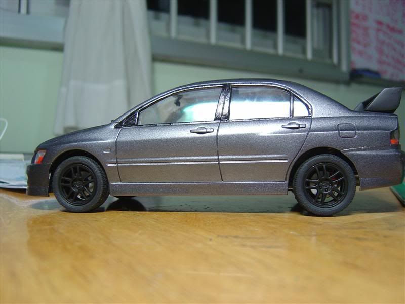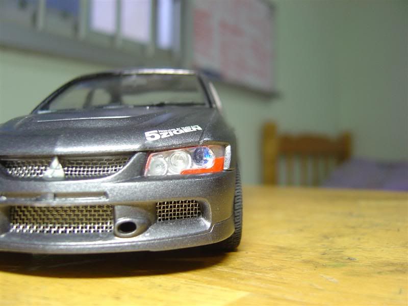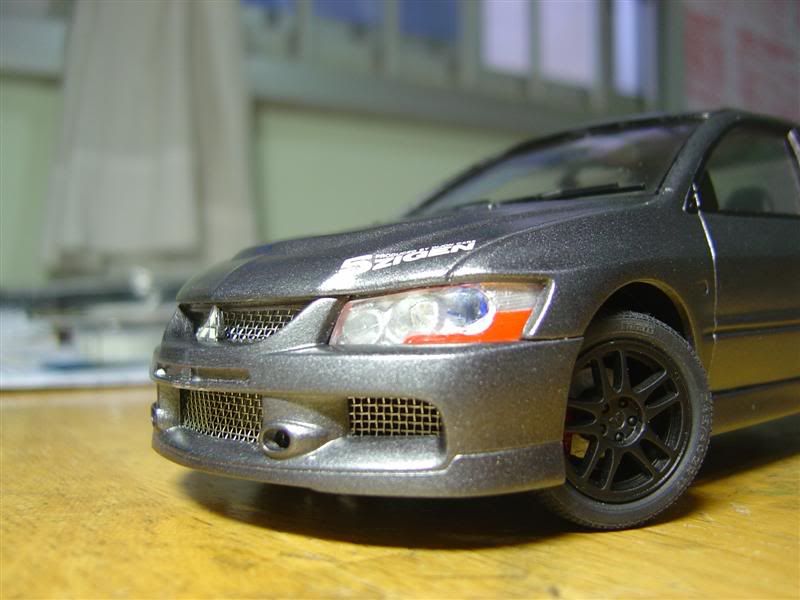 This thing eats the realistism of the kit definately, as does the wrong name badges, the car has evo9 bumpers (though the front bumber is made wrong around the Mitsubishi badge), but the badge on the trunk says Evo VIII MR.