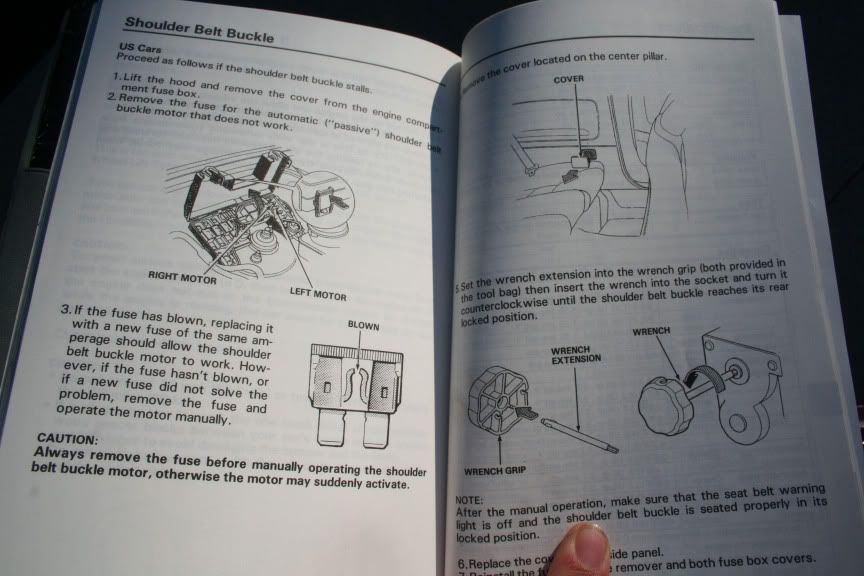 hmm i was reading through the owners manual, and there seems to be fuses that are linked to the belt motors (one for the right and one for the left)...cant I just unplug those? (and there are holes by the back seats where you can manually crank the belts should they fail.)