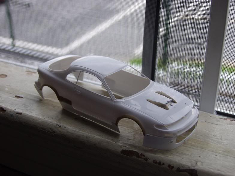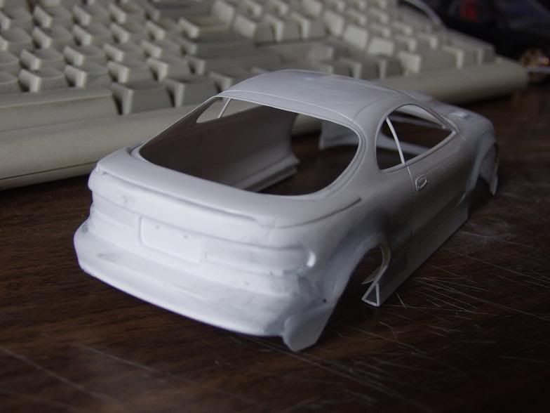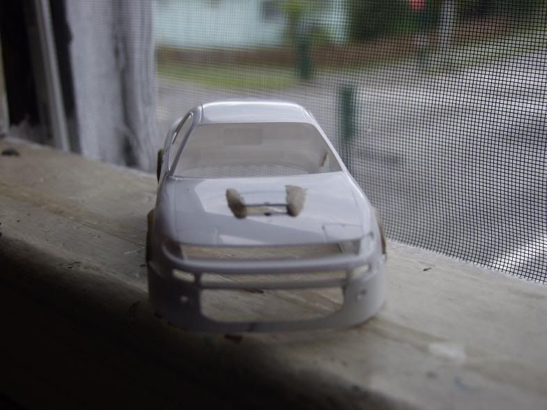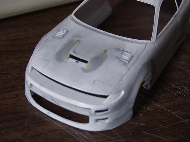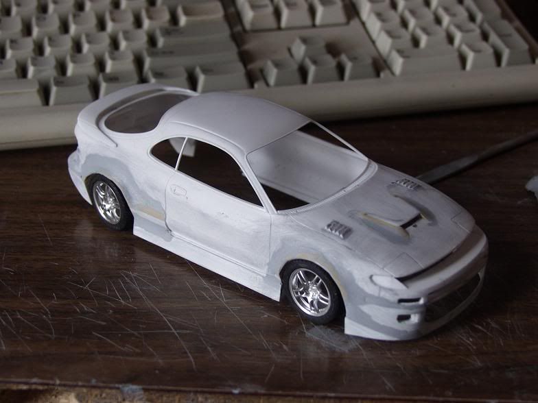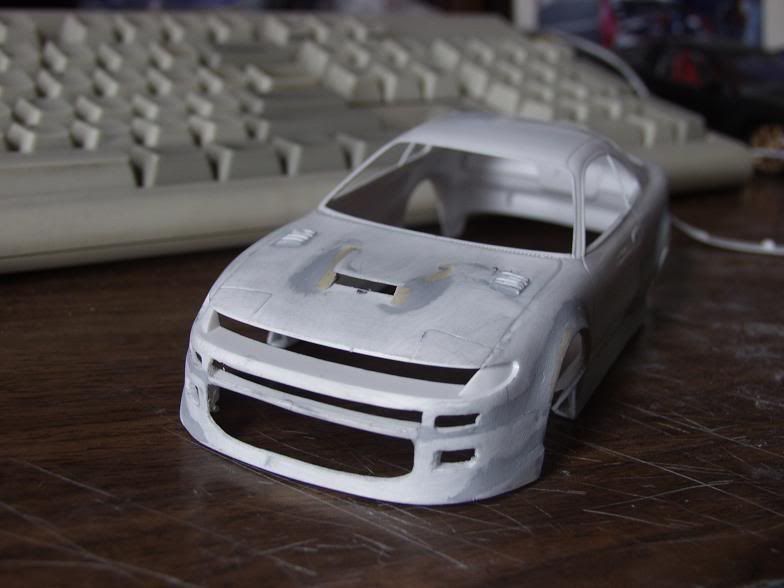 well i have some more progress to report on this one.. i've flared the sideskirts out more, finished the slatted vents in the hood like the alltracs have, made the two smaller intakes, and puttied eveything up and gave it all a rough sanding. I've decided to use R33 rims with it, cuz i had them laying around and they seem to fit fairly well, and im using the stock wing, as it also fits well with the bodykit still. well here are all the pics...