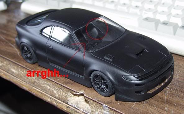 well i've had a bit of boring progress on this one... so i got fed up with seeing it just sitting there, and i had a can of flat black spray, so guess what, i painted it (and almost all the parts for it) flat black, and let off of the bodywork, even though the putty was cracking , i just want this for a fun/quick custom... so here are the pics, generally self-explanitory... and yeah... the windsheild cracked... arrghh... not sure wether that was from me or what... but yep.. it sucks. now for pics.