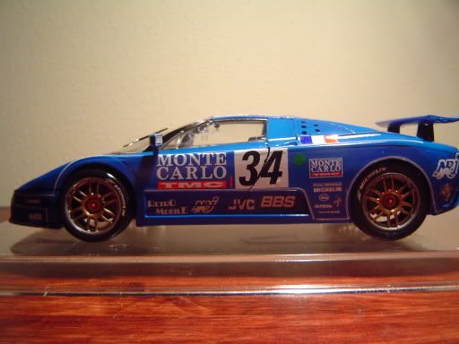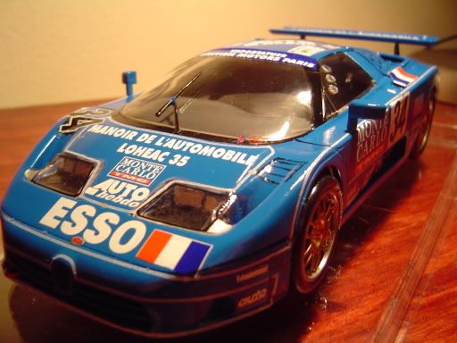 This is a model of the 1994 Lemans contender Bugatti EB110SS. The car raced well running 6th overall. After replacing a blown Turbocharger, it ran in 17 , but a blown tire sent it into the wall at hour 23!