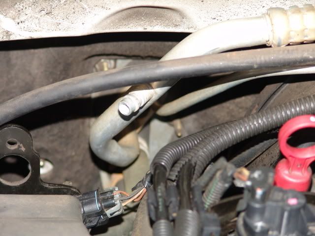 The low pressure port is the smaller of the two ports, located up top to the left of the trans. fluid dipstick, dust cover removed for clarity. The high pressure port is under the brake master cylinder and should not be used.