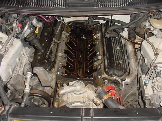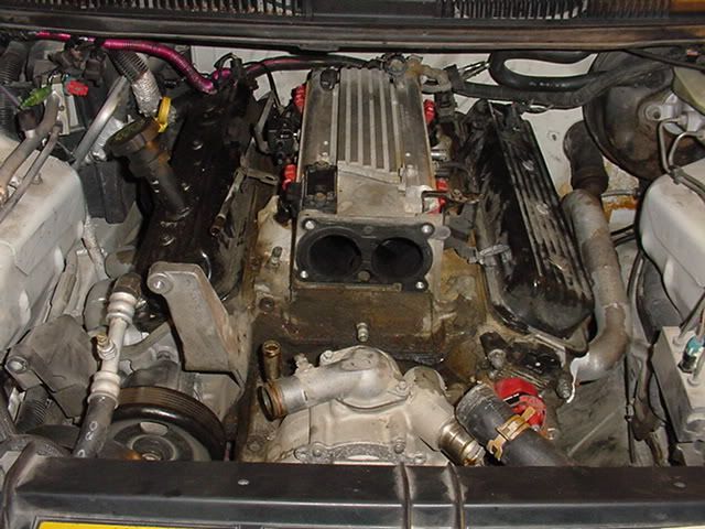 Well... I finally broke down and tore the car apart... I've had a LT4 Hotcam Kit laying around staring at me for a month or so and now it's going in, with addition to a few other things. The new additions are going to be the cam, ported heads, match ported Intake manifold, new 1.6 rockers, springs, etc (all in the kit), pushrods, Heavy duty timing chain set, CSR electric water pump, pacesetter longtube ceramic coated headers, msd cap & rotor kit... the list goes on but I think that's most of it. So anyways, here's some pics...