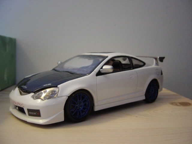 Pretty straight foward build. i turned it curbside as the engine will be used in my FIT/Jazz. :wink: The wing stands are stock but it has a new spoiler. Painted the hood semi gloss black and the car is pearl white but i could get the pearl of of it..... :cry: The front bumper is from the box but i filled in the holes on the sides. Painted the look-a-like O.Z supers. blue. The interior is stock. That pretty much it. :D
