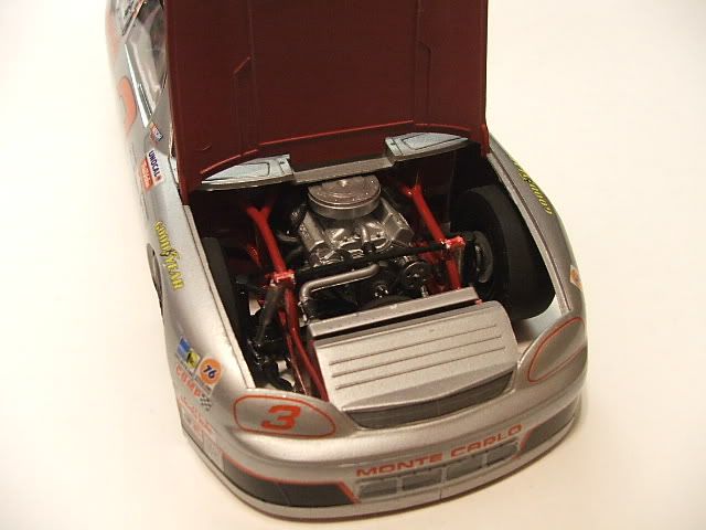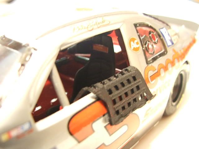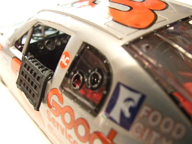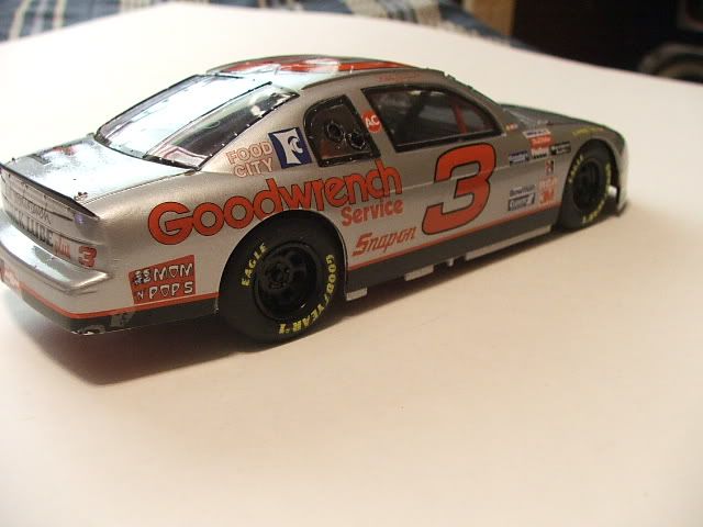 Finally got this one about knocked out. The last run to the finish was somewhat rushed. I was just ready to get it on the shelf. It is missing the exhaust. I was unsure if the kit exhaust was correct or not. It has the split pipes exiting both sides. The pictures I had, I couldn't tell if it only exited on the driver's side or on both sides. A couple of mishaps. When I masked off for the black spoiler, it seems to have pulled some of the clear over the black decals away. Also, I tried the same method I used on the wrangler car for the net. But thanks to the thick casts it cracked and boke and looks out of scale. For a shelf peice, I'm pleased. Anyway here it is. Comments and criticisms please!