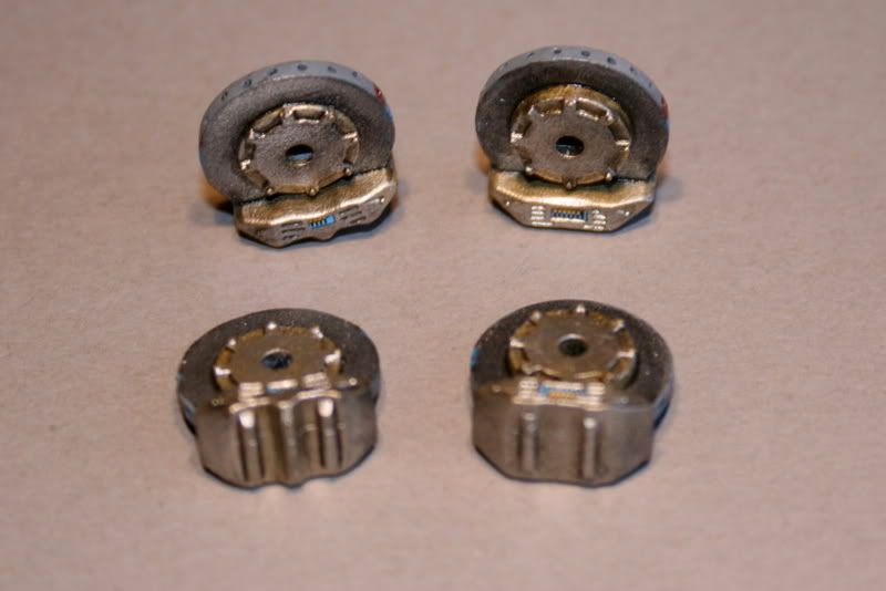 For the wheel nuts, I just used the ones that came with the kit. One side are black, one side red. I used a nail file to sand the edges for the black side. On the red side, I just completely removed all the paint from the nut, polished it, then painted it with unthinned Tamiya Clear Red... the results were fantastic.