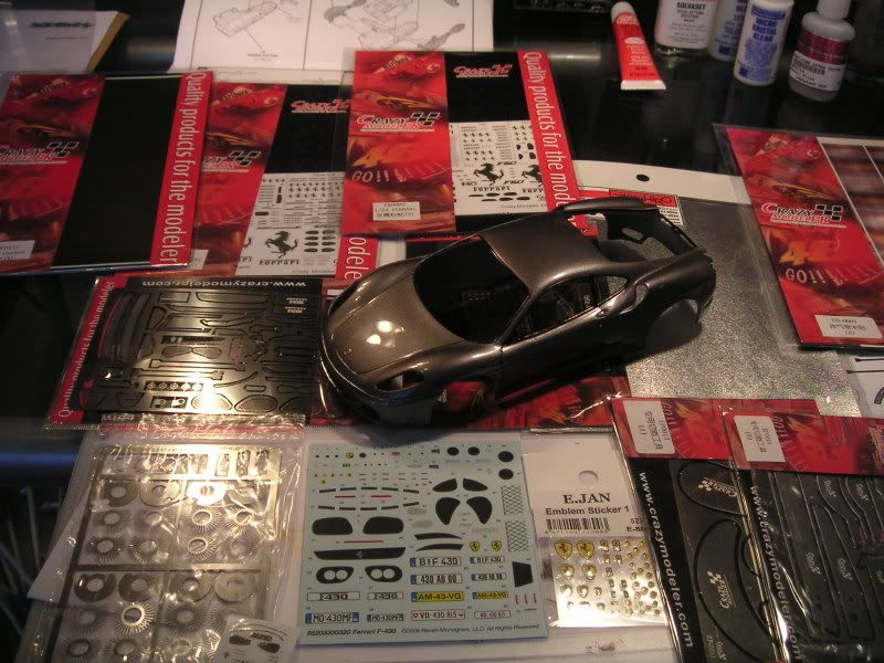 Very nice. The paint looks awesome--great shine. I will have this kit in my hands by next week; I plan to paint it--who knows, maybe black. I don't think I'll buy massive quantities of detail accessories like you, but I will maybe look for a P/E sheet--maybe--for sure I will add major detail in the form of wiring and plumbing, and so on. The nice thing about the F430s is that there are tons of pictures--large pictures--available in easy places like Google images. All you need is a good printer :wink: And the engine bay is so clean; you could eat off of it (don't know if I'd want to, though; the spaghetti sauce would mess up the carbon fiber and crinkle-finish red paint :lol: ) That decal sheet that came with it looks nice--more decals on it than the sheet for the Enzo, but half the parts :screwy: Anyway, I'll drool over your thread until I build my own model, then you can visit mine. But right now, it's not about me. Sweet model.