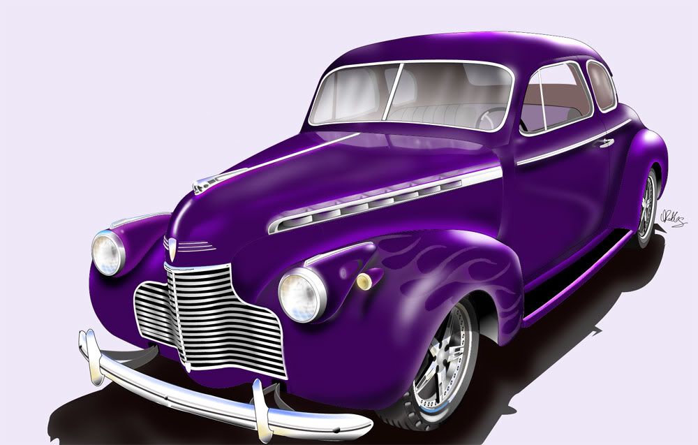 I did this in Illustrator, then colorized in PS. Still trying to work on detail.. I had a 40 Chevy in high school... sure wish I had it now. CC's welcome... working on shadows and lighting... suggestions? thanks, Robo