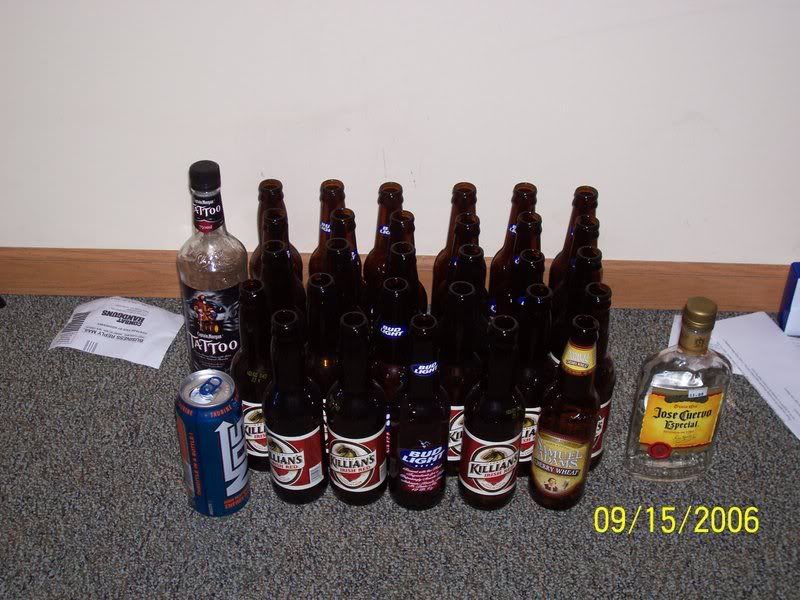 That is an entire fifth of Capt. Morgans Tattoo, a pint of Jose Especial, 30 beers (mixed of Killians, Sam Adams, Bud Light, and Bud Select), and a can of NOS energy drink. For those wondering, a Rattle Snake is: Jack, Johny Walker, Smirnoff, Bacardi O, Bacardi 151, Amaretto, and Sweet and Sour to taste...You can't taste any booze in it at all, so you can easily knock them back. Thats why I had eight.