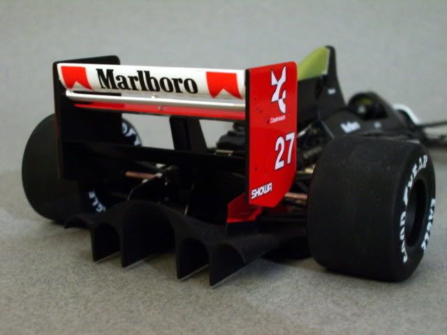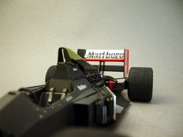 The top part of the wing is finished.I chose not to use the Museum Collection decals because of the problems I had with them earlier.The Marlboro logo's are from Tabu Design and the red/orange Marlboro crests are from the Tamiya sheet that came with the kit.They are also the best match to the Finishers MP4 Red.Here is the top part front.