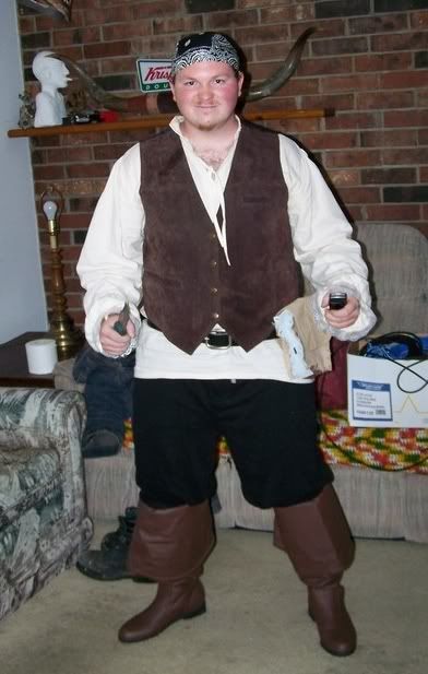 This is the start of a piratical costume...I've got a hat, a crappy-looking sword, and a red sash since this pic was taken tho. I really got the costume for ren faires and Amtgard, but it can work for September 19th International Talk Like a Pirate Day and my obligatory once-monthly wearing of pirate attire to please the Flying Spaghetti Monster (and help reduce global warming!).