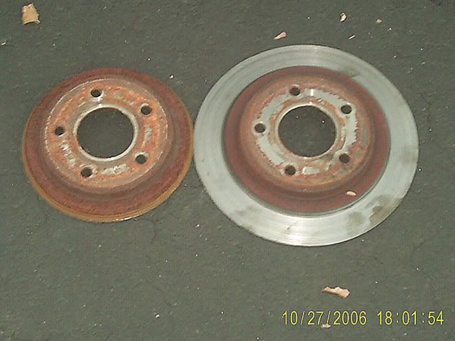 Not exactly Grand Prix related, but I thought you guys might get a kick out of this picture. This girl I know has a '99 Lumina ltz. One day she says the car isn't stopping. I check the brakes and there's virtually no pressure in them. It had brake fluid and I checked the pads. Well, I think I found the problem. The picture below are the rear rotors, driver side on the left and passenger on the right.