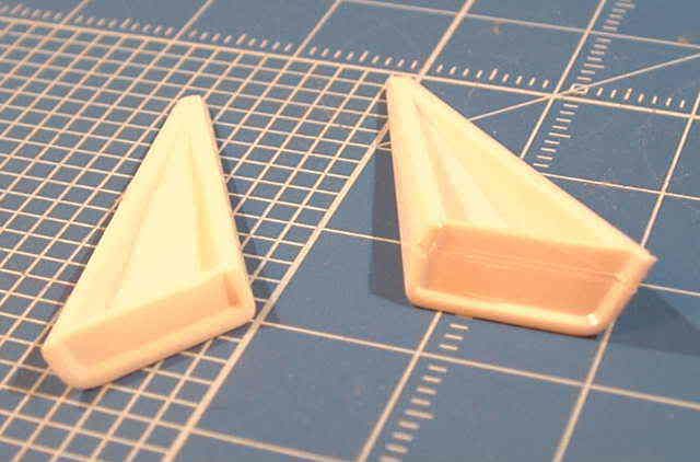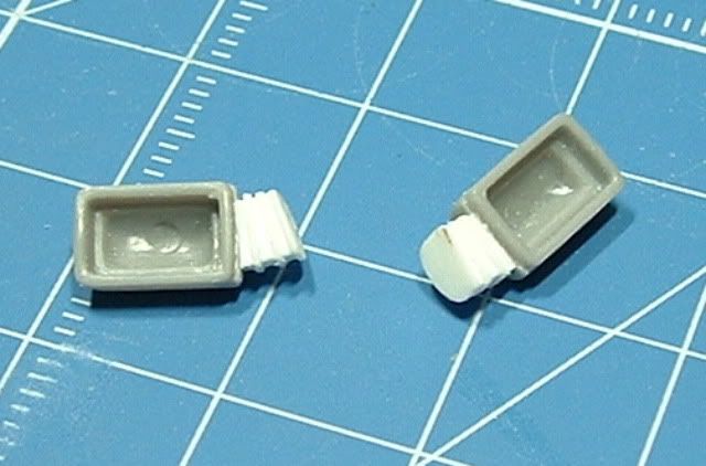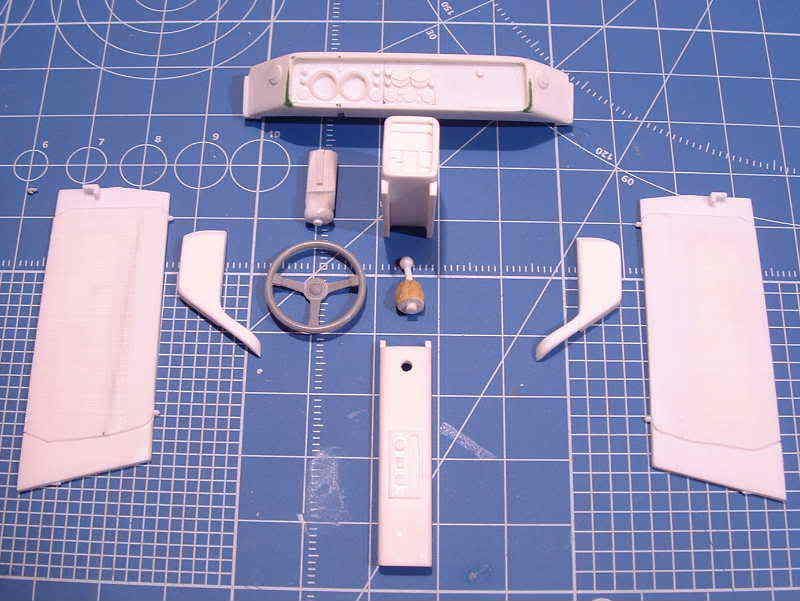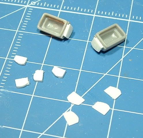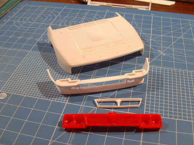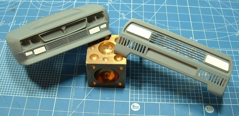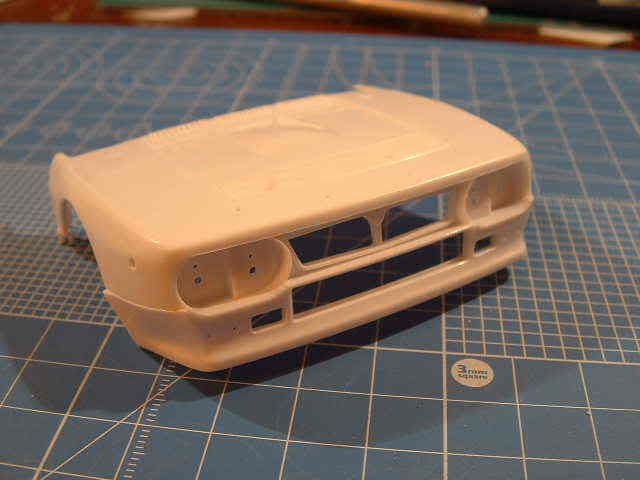 The front headlight assembly is very similar to the Lancia Delta, so I looked to Hasegawa's 1/24 kit of such for donar parts. I cast copies of the Delta part in resin (not pictured) to use the headlight housing ends only.