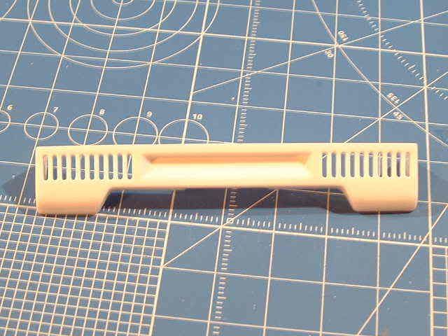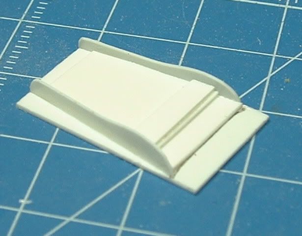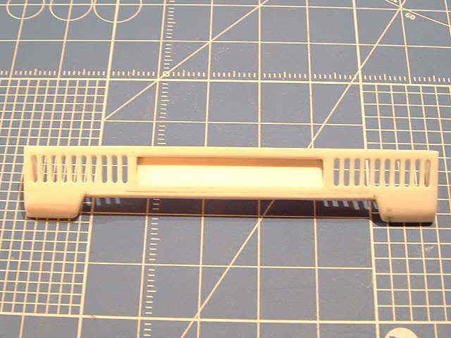 For the rear grille, I used strips of aerofoil shaped styrene used by airplane modelers. These needed to be cut in half length ways (not easy when they are about 3mm wide). The strips were then set between spacers made from sheet styrene.