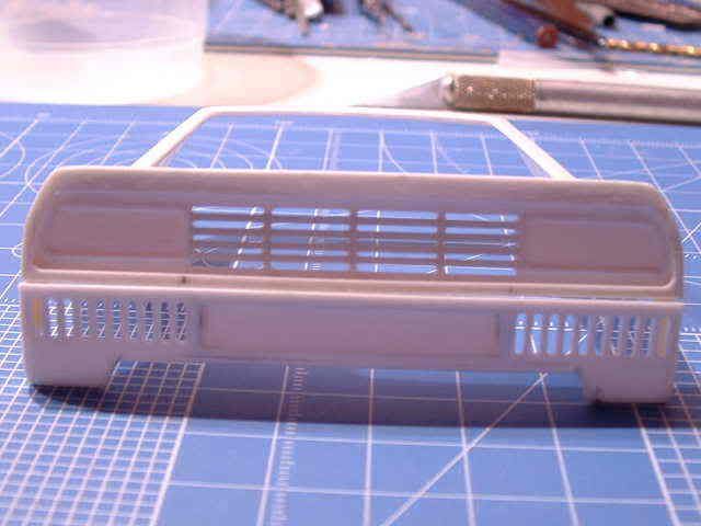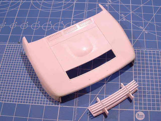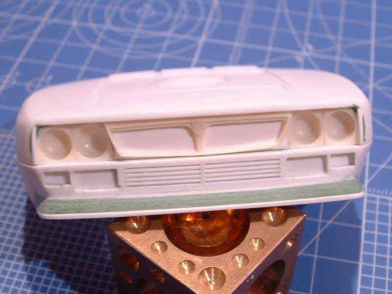The Lancia front grille which was carefully removed from the original kit part is alot narrower on the rally car so it was widened accordingly. The delicat part was then duplicated in resin.