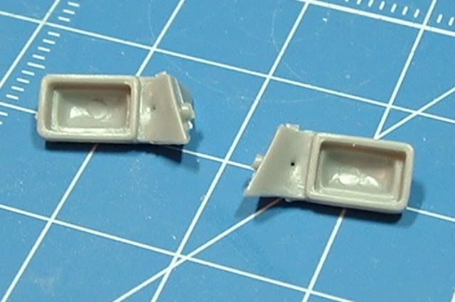 I took the side mirrors from the Delta kit as a basis for the 037's. Only the mirror section was retained and the new supports were made from laminated styrene. Shapes were dupliced several times over from 2 different thickness sheets then sandwiched together to achieve that ribbed effect.