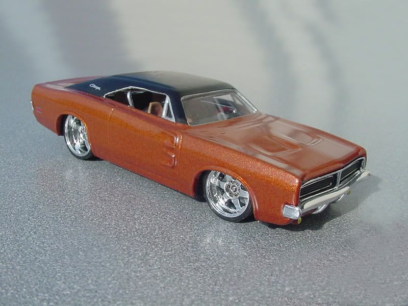 A sort of tribute, I guess, to a Charger my wife used to have. Her's was a '71 R/T, but she chose the casting without my supervision thinking it was close enough. We mixed a color that is kind of like what was on hers, but this is a lot oranger. I put a full vinyl top on it, even though her's was a landau half roof style. She likes it so that's all that matters... - Mark