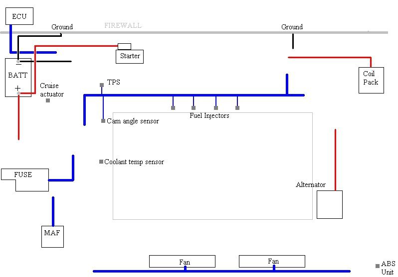 If you were to go out to your car, find the wiring from the ECU thru the firewall and follow it with your hand, where does it go to? Are there many branches off of it? Is there just one harness or are there several small ones? Where do the second power and ground wires from the battery lead to? Where to the smaller wires from the starter solenoid lead (in respect to the rest of the engien bay)? I'm still not entirely sure how the alternator is connected to the battery... How about the signal wire for the coil pack?