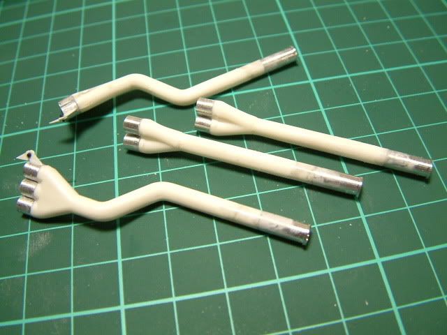 Here are the original kit parts on one group of three outlets and a comparison to the original collectors and pipes. That is what I will try to achieve in scale.