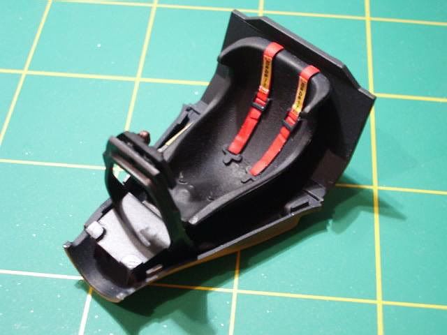 Finished the seat and installed it into the bottom section of the monocoque.I sprayed the straps red,masked them out with strips of Tamiya tape and then sprayed the seat black.Once I've filled the headrest part that fits into the main cockpit tub to smooth out the join,I will add the seat section and fill the main join line that remains as there isn't a join on the real car.It means I will have to mask the cockpit opening whilst I spray the main body colours or the seat will get oversprayed.Reminds me of my aircraft modelling days all over again!! Here's a couple of cockpit pictures so far.