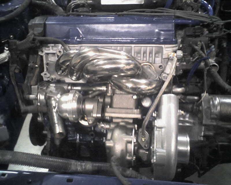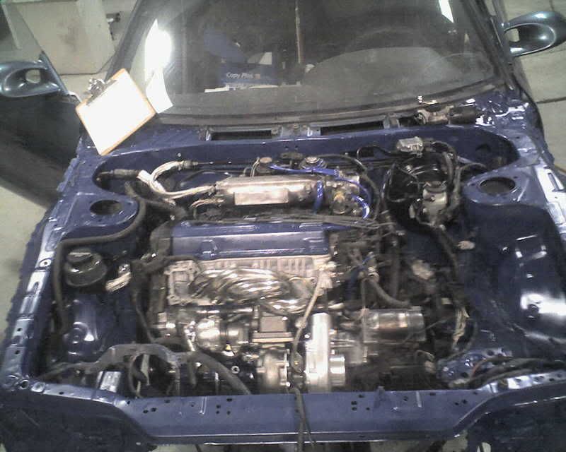well those of you who have been around for a while may have kept up with my rebuild on my 92 celica GT 5 spd. Its been a year since I started tearing it down, and I've put a ridiculous amount of work into it, more then what most people probably would have bothered with. Due to the fact that two GM pieces of crap cars (my daily drivers) died on me. I am forced to get my celica back on four wheels, the problem is, is that I don't have everything I need to finish up the turbo, so unfortunately I had to pull everything out and return it all to stock just so I could drive it. But on the brite side of things I have a very pretty turbo sitting in my hatch :frown: . but I am still happy to see when looking at the pictures of the engine bay just before I tore it down to what it looks like now, I am very pleased, and that f1 stage 3 clutch has some madd Grip!!!!! well here are some pics. Yes I know that is the xs manifold, but for those of you who are going to write me back complaining about it. it doesn't matter because I"m going to try it anyways, and no my turbo isn't going to go hopping down the road when it breaks because its secured in case it does break, and I will be keeping an eye on it. I am more or less going with it because I am just curious. So now that, that is taken care of here are some pics.