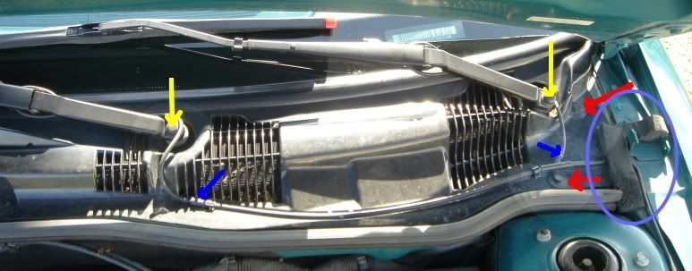 - Next disconnect the washer fluid lines, shown with blu arrows.