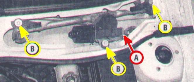 - Remove Motor & linkage assy bolts, "B" in yello,