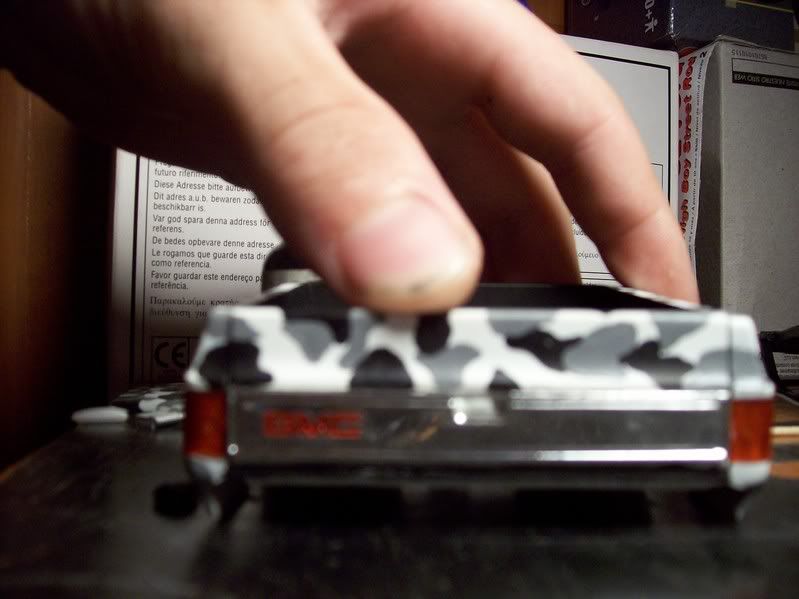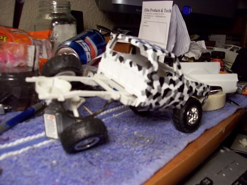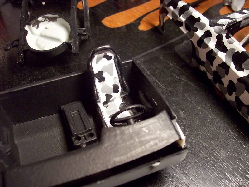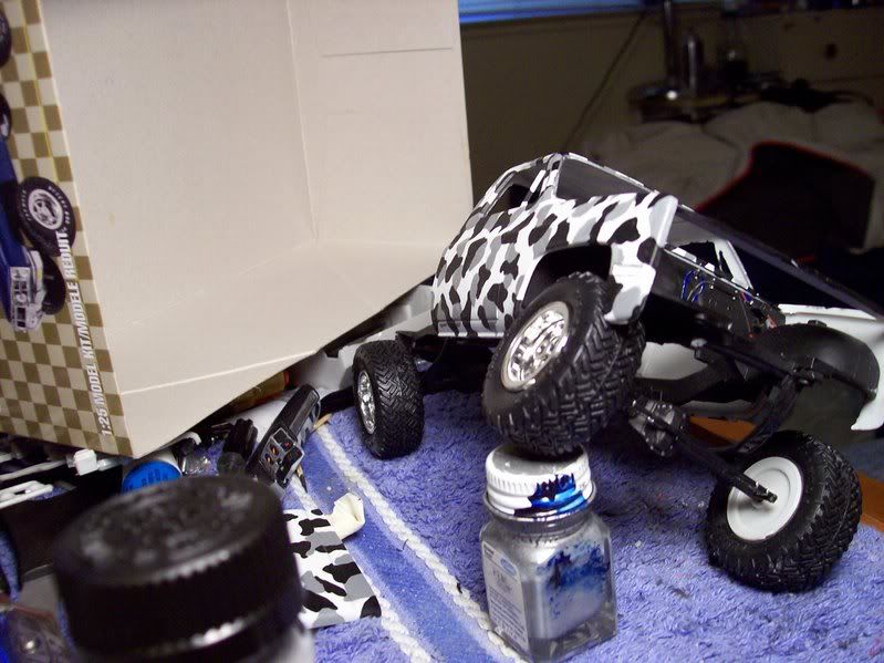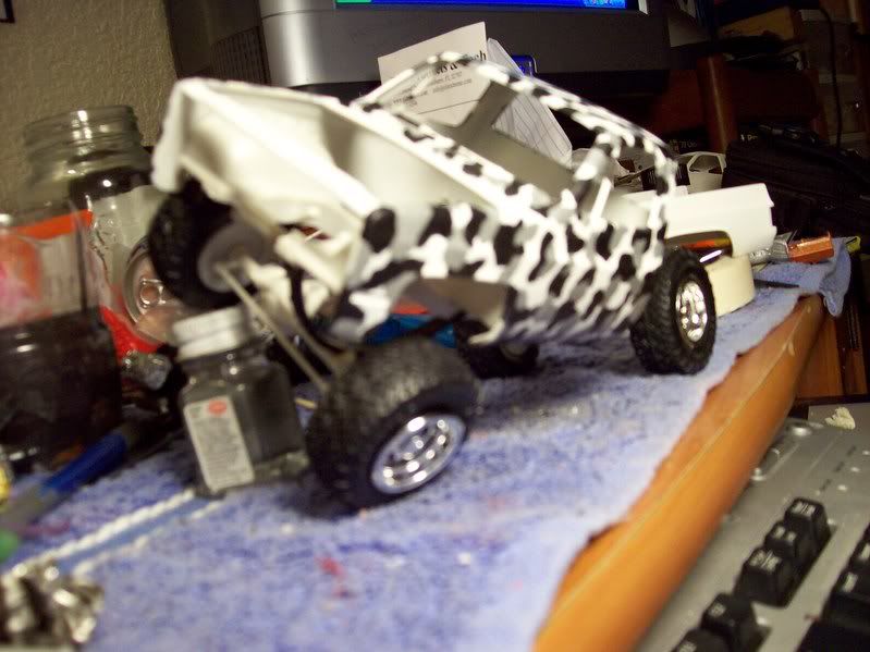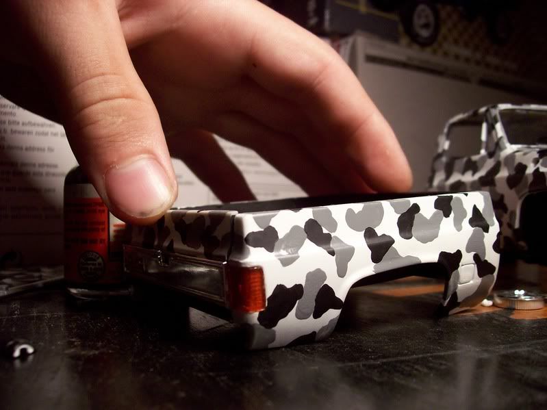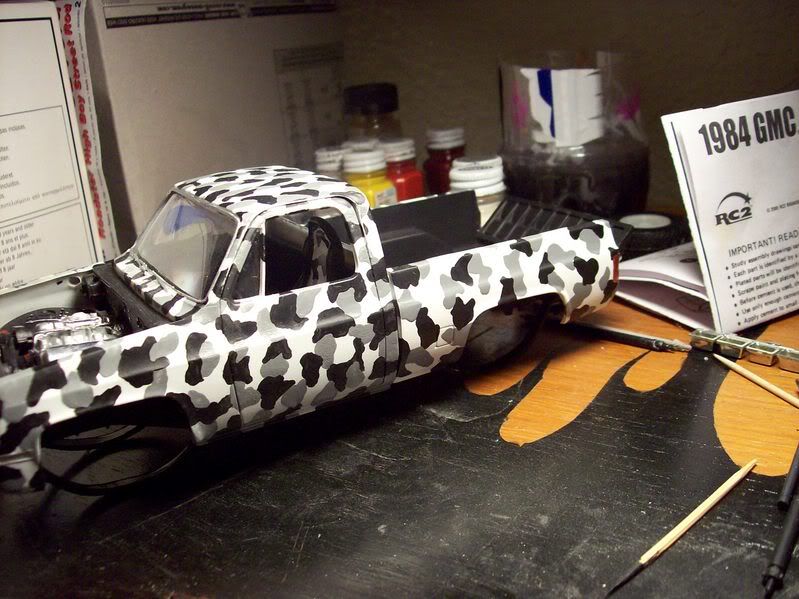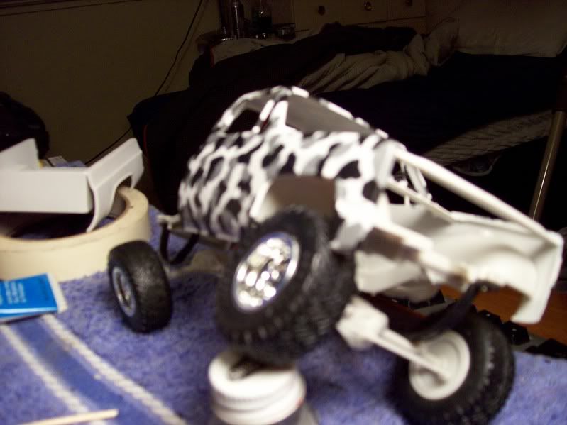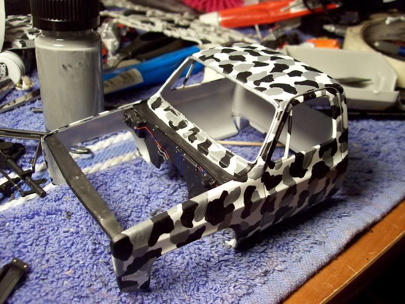 Went to Wal-Mart about 20 minutes ago and bought some paint, I'm going to do Snow Camo so I got the Color Palace - Flat White and some HOK - Military Gray, I started on the camo and here's the progress