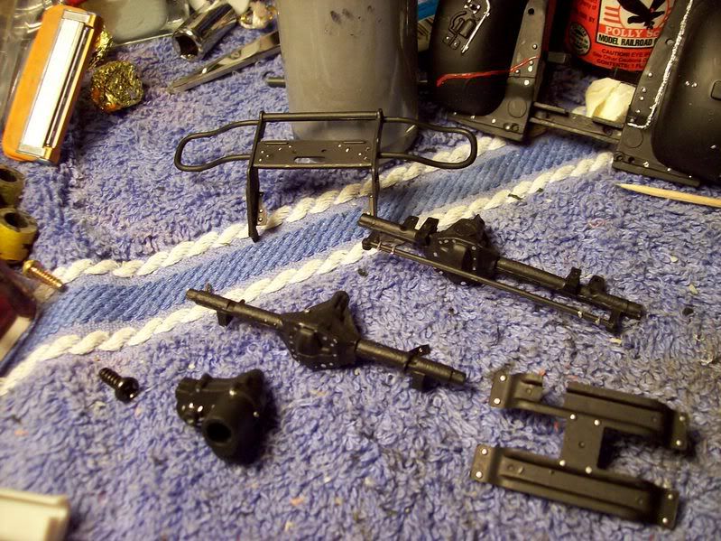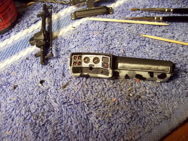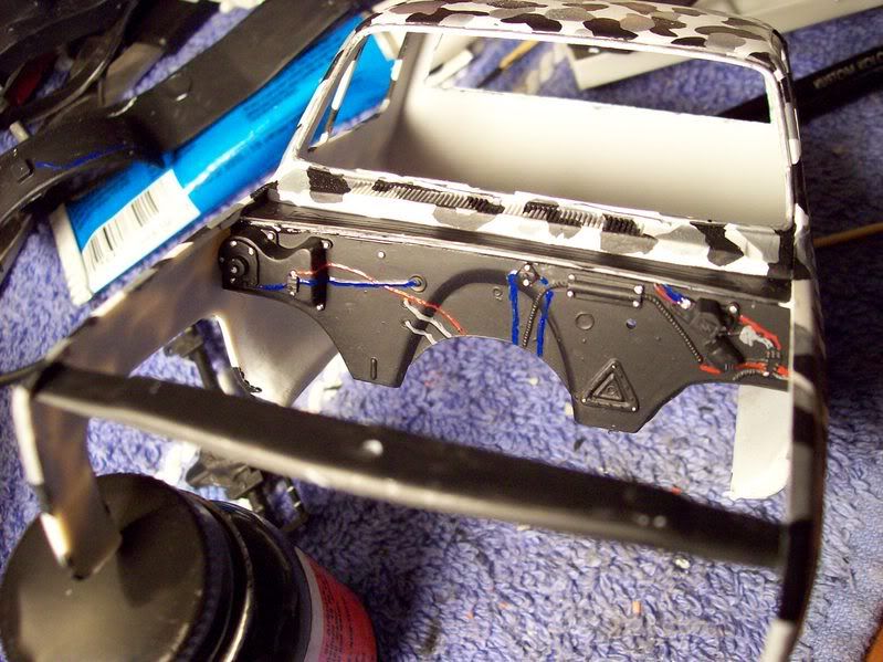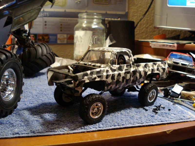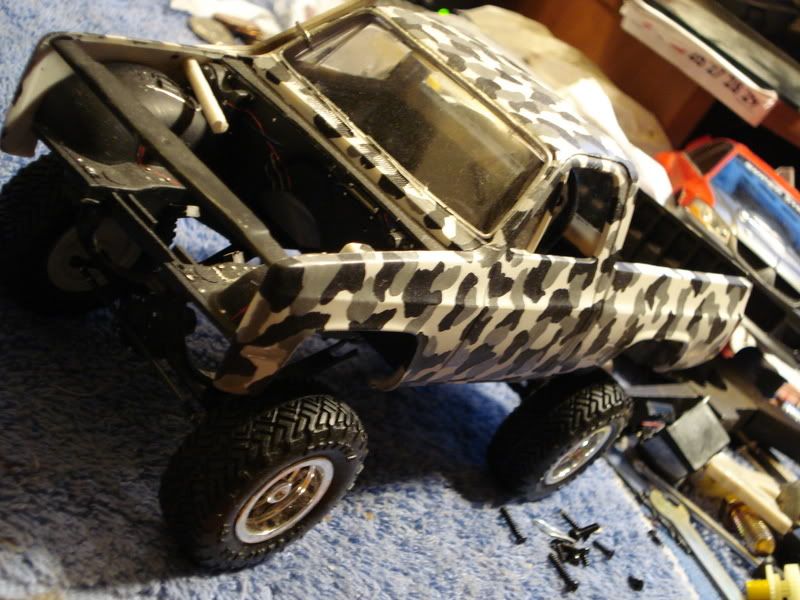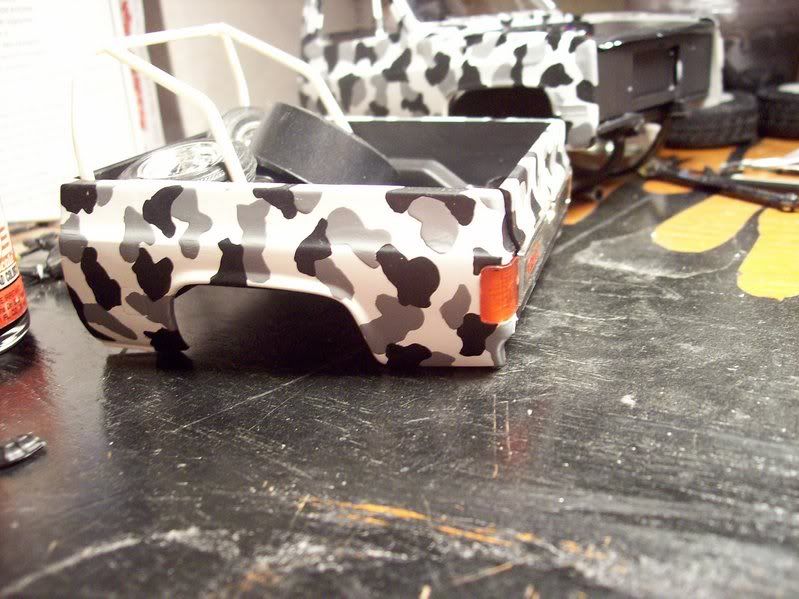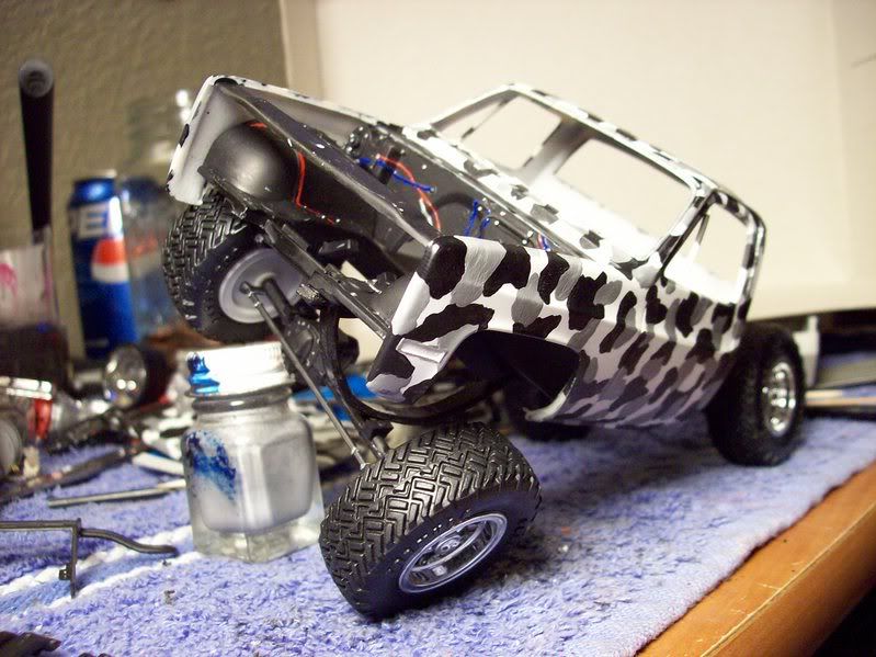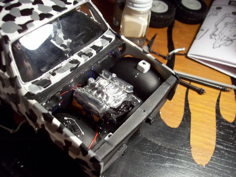 Ok, I have an update, lots of pics. I finished the camo on the bed...I think it needs more what do you think?, Finished the interior, threw in a big block but it was really tall and hit the hood without an air cleaner which is why I'm making the snorkel, and I'm in the process of making a new rollbar for it, and finished the grill.