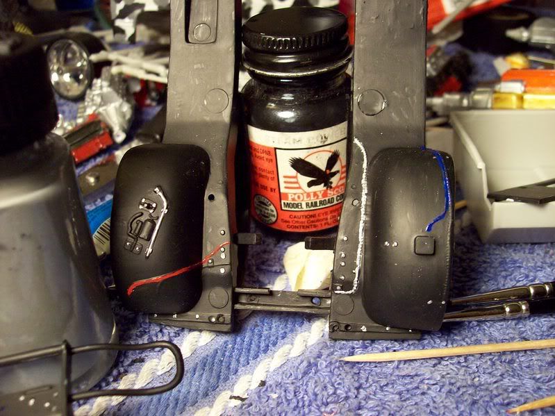 Those tires and wheels look awesome! I'd say go for em! That paint scheme is looking great too. Very nice work!