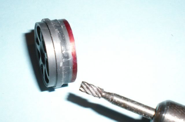 Ridge is trimmed with a dremel and the wheel is shortened in the back with saw.