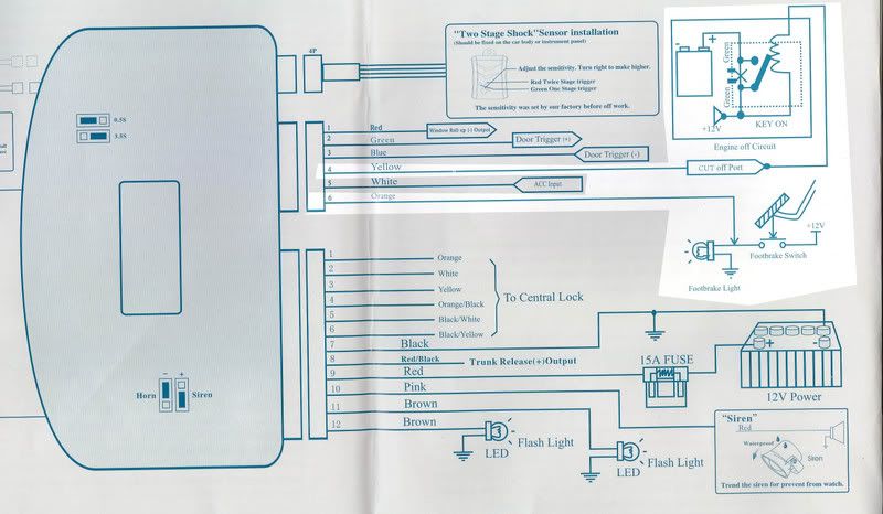 I plan on installing this alarm along with two power door acctuators this weekend. I think I understand everything, except for the highlighted part of the attatched diagram. Please someone help. I have a 2003 cavalier coupe. Also, that part that says to hook up to the flash light led, can i hook that up to my headlights or blinkers? so they flash when it turns on, and if so, where do i hook into that?
