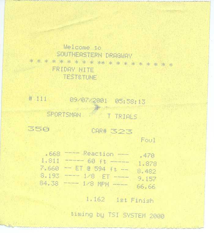 http://www.fiero.nl/uploads/1fsttime9701.jpg - best 1.8th mile time I'm #350.. = 12.78 in the 1/4 but i've yet to break 12.92. (NHRA states 1/8mi time X 1.56=1/4mi time. )