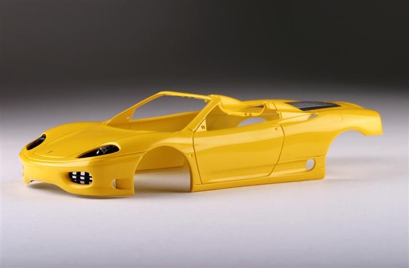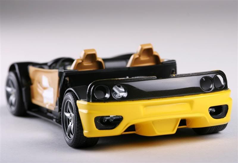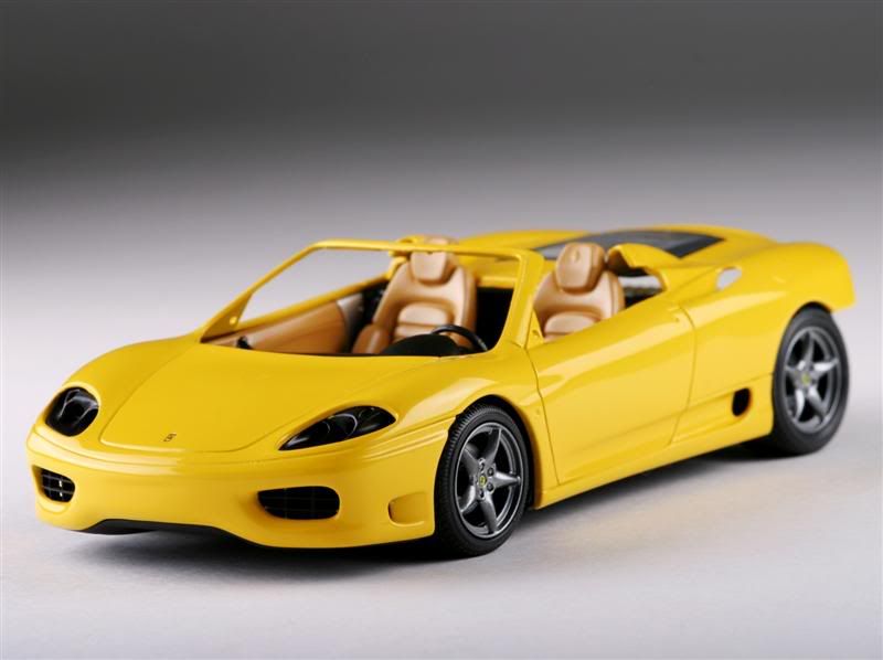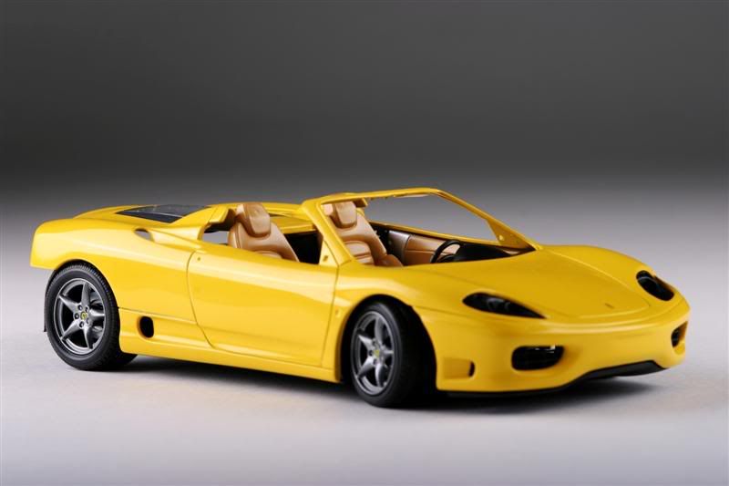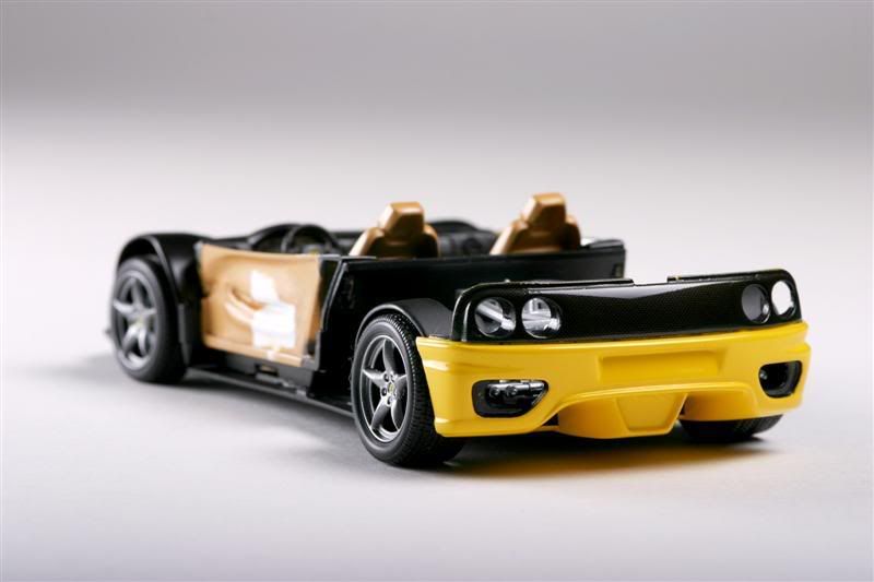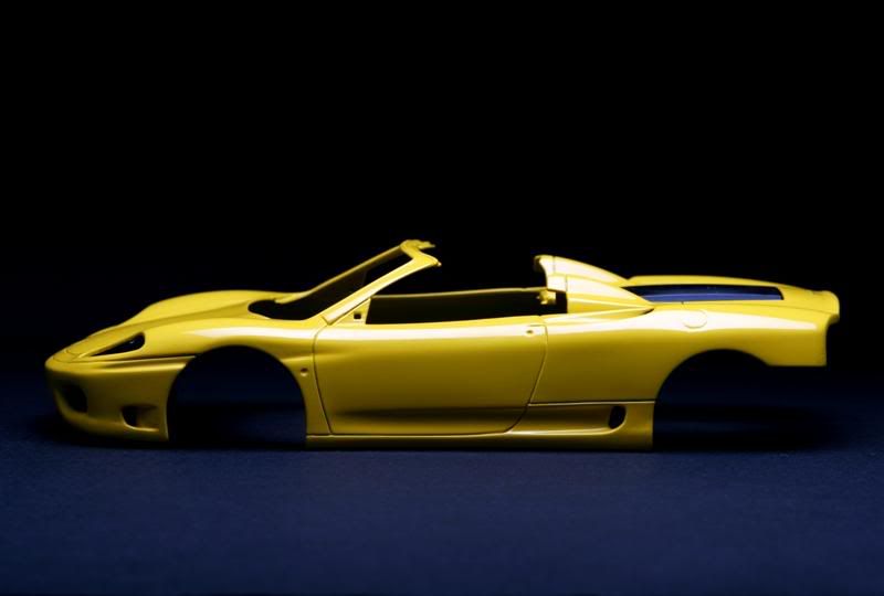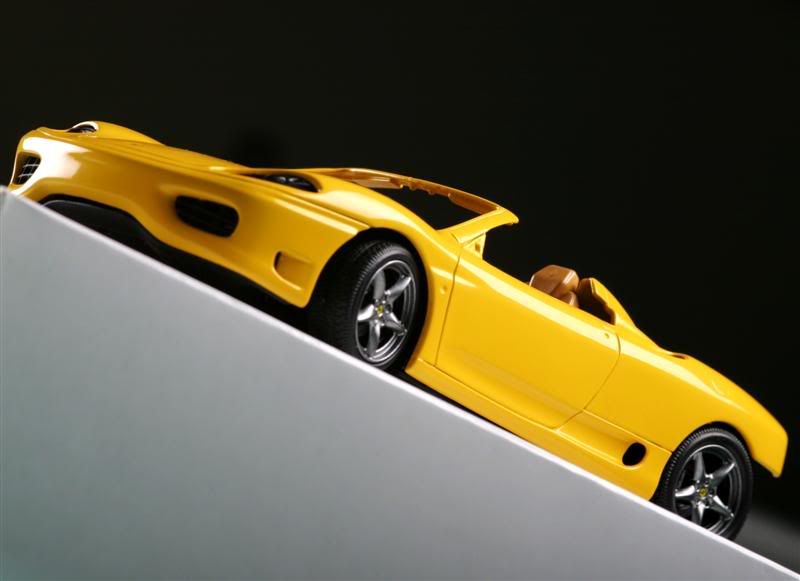 Revell's Ferrari 360 Spider painted. Chrome was stipped from the wheels and painted a mixture of X10 and X11. Body is Krylon Fusion Sunbeam/Safety Yellow over a duplicolor chrome yellow base. No clear coat. After drying for around 24hours, body was wetsanded with 2000 grit, polished with turtle wax polishing compound and finally waxed with turtle wax. Paint, compound and wax are all Wal-Mart specials. This was really an experiment to see if I can get a decent shine without needing to clear coat. I think it came out OK.