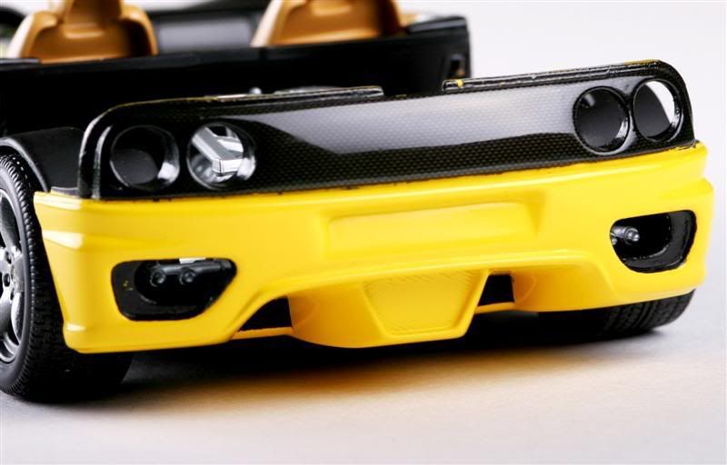 I though the solid yellow was boring, so I painted the middle section X18 then decaled with Aioshima CF (it came with a wing kit I bought). This stuff is T-H-I-I-I-I-N! The solvaset eats it up if it isn't touching plastic. It was also pretty bright, so I toned it down with X19 smoke. I think it's pretty convincing. This car is based on a real 360 spider that I saw in the parking lot the other day. I think this part was mesh on the 1:1. Not on mine...:evillol: