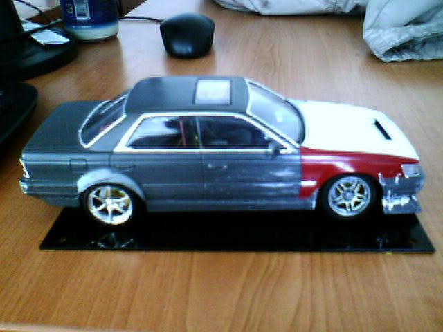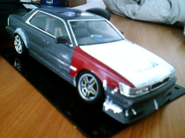 also changed the front wheels to r33 rims(i crashed and ended up ruining the right side front of the car, hence the replaced fender and hood and rims, and the taped front chin. :D:D)