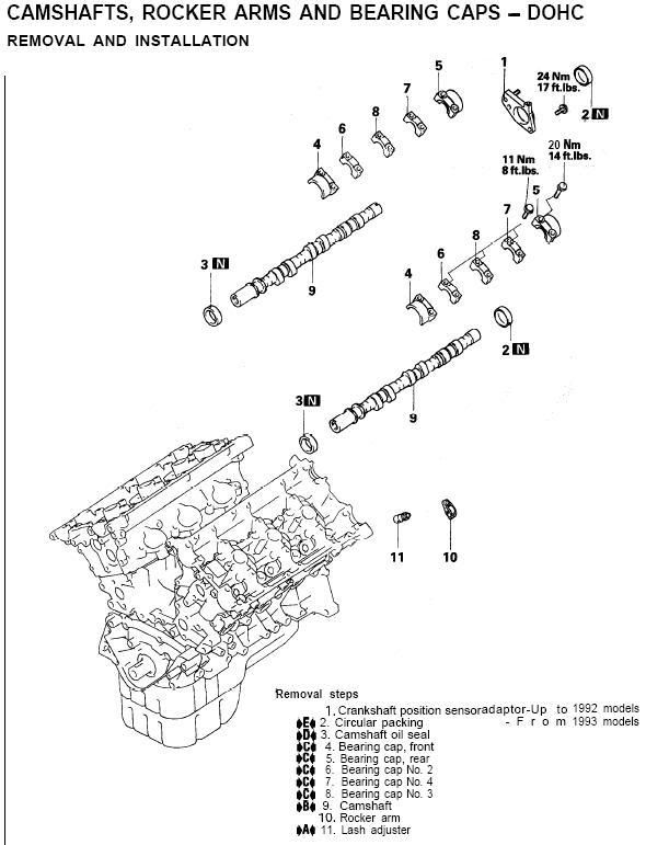 you may have forgotten to do this, but here it is for when you remove the cams NEXT time: keep the cam journal caps matched up to the exact same journal from which you removed them. for each cam there are 5 caps (one on each end and 3 in the middle). the arrows point in the same direction as the arrows on the inside of the heads (cam caps point toward timing belt side on front bank, and towards battery on rear bank). the E is the exhaust cam CAP and I is intake cam CAP. however some cams have different markings. make sure to torque the cam caps to the specific torque spec. use assembly lube or engine oil. see the following pics for all the detailed info.