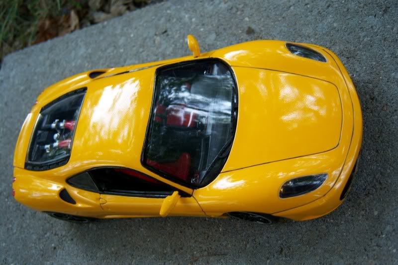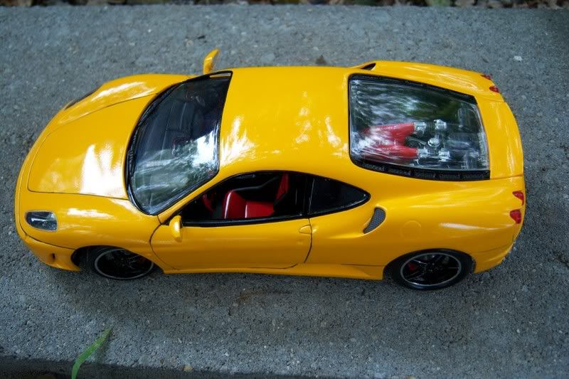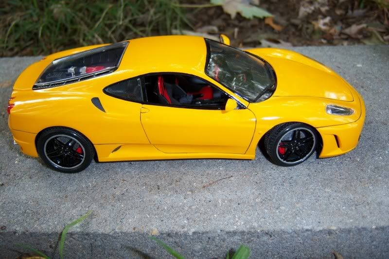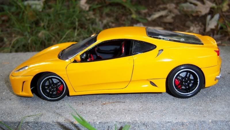 Hi all, thought I would post a couple pics of my Revell F430. The paint is a not-so-smooth Tamiya Camel Yellow. I used the revell Focus racing seats, but otherwise its boxstock. I painted the rims Metallizer aluminum plate with Tamiya black spokes, I think it helps set off those red calipers.