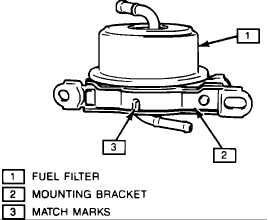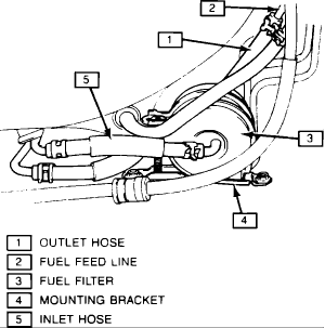 6. Remove fuel filter, mounting bracket, and outlet hose as an assembly from the vehicle.