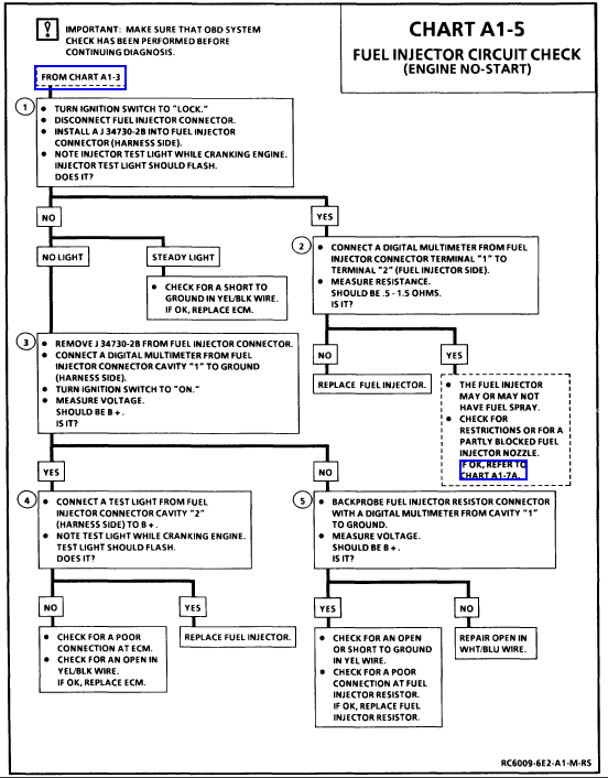 HAVE + 12v. @ yellow wire key on @ injector tbi connector. Injector solenoid will spray if i intermittently ground the yellow wire with black tracer @ tbi connector. I suspect ecm is not supplying a ground pulse, on yellow/black wire. Noid light will not light at all when in connector to tbi. But my test light hooked to ground will show power on that yellow positive wire. Please fellas, what should i be looking at next? Bad ecm? COULD the injector resistor cause this symptom? Ideas to try ANYONE. What resistance should a check of the resistor show in ohms? Sorry for such long wind. I just need help and trying to give at what little i already know on this thing. Thanks to all.