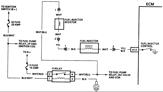 5. Checks for an open or short to ground in YEL wire, an open in WHT/BLU wire or for a faulty fuel injector resistor.